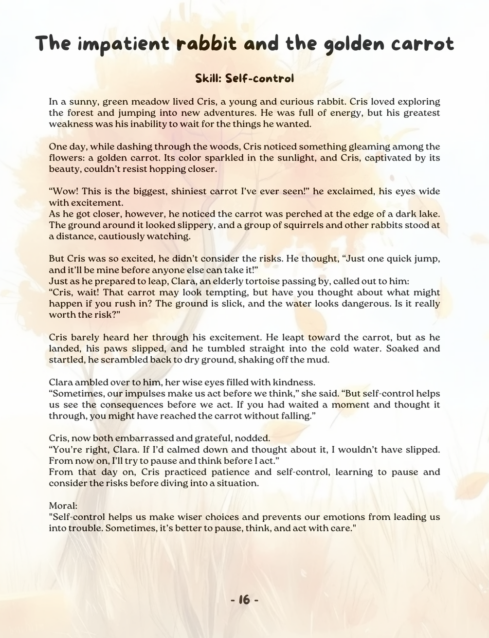 Each story features lovable animal characters who model essential life skills like empathy, teamwork, emotional resilience, creativity, and problem-solving. These fables not only engage children but also inspire them to reflect and learn how to handle their emotions, work together with others, and make thoughtful decisions.